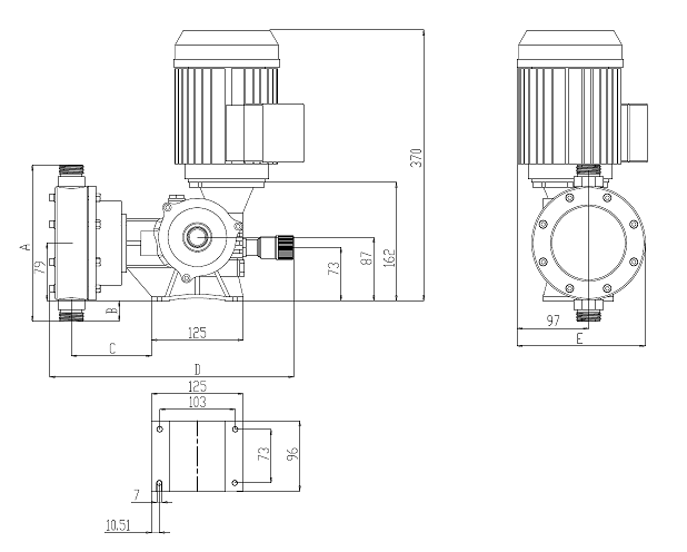 電機驅(qū)動主軸連接的蝸輪蝸桿減速箱形成減速機械結(jié)構(gòu),軸承在偏心軸上的偏心部分,偏心軸在減速箱輸出軸的帶動下旋轉(zhuǎn),軸承在偏心軸的偏心圓上做偏心運動,所產(chǎn)生的偏心距轉(zhuǎn)換成推桿的直線運動,在彈簧回復(fù)力的配合下推桿帶動膜片做直線往復(fù)運動,往復(fù)循環(huán)一次叫做沖程,往復(fù)的距離叫做沖程長度,每分鐘往復(fù)的次數(shù)稱為沖程頻率。